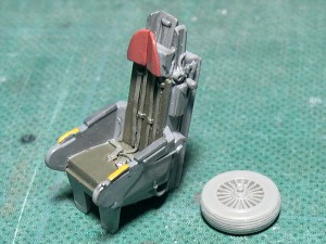 ![]() The ejection seat was from the box except for the seat belt made of a lead sheet. I engraved tread petterns of the nose tire using a etching saw. |