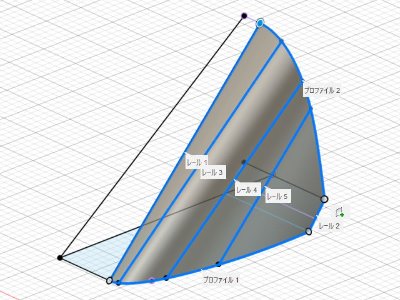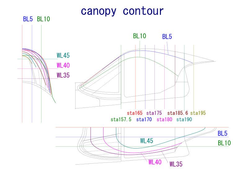![]() キャノピは4断面のロフト。レールは正面から見て0°、30°、60°、90°の平面と断面図が交差する点をつないだもの。 |