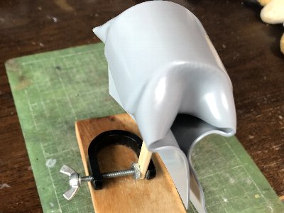 ![]() 台に取り付けプラバンを絞ったところ。ちなみにカウルの右半分。裾を締めているのが分かるね。 |