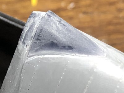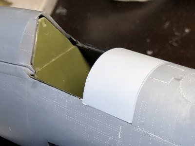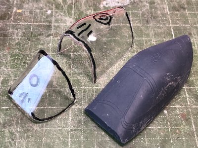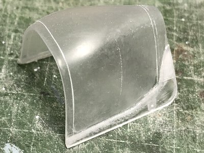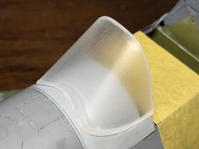 つうことで、最終的に使用した木型のファイルをお持ち帰りリストにアップする。従前の木型ファイルも、ジャストサイズのキャノピや、後方フェアリング、風防下の胴体上部などがあるため、残しておく。 さて、コルセアのキャノピの裾は、外に広がっているため、手絞りでは再現できない。クリアプラバンの絞りにバキュームは不可能(←やってみれば分かる)。だから裾は後付けするしかないわけ。接着部はこんな具合だ。 |