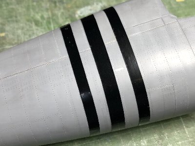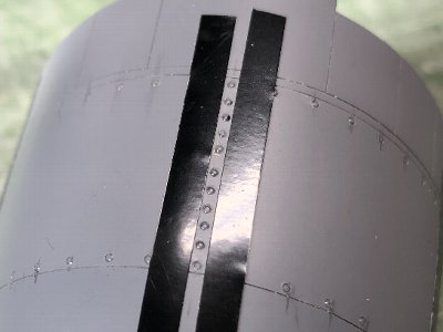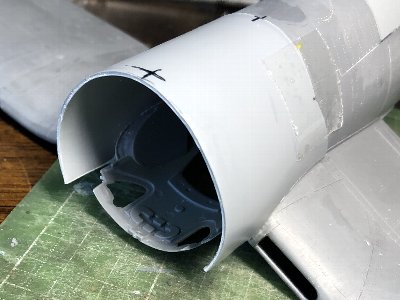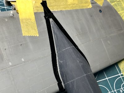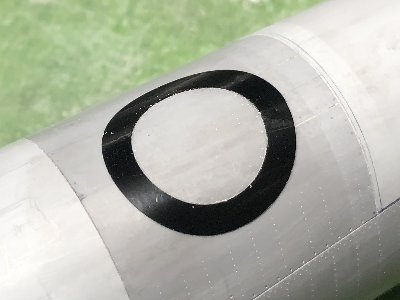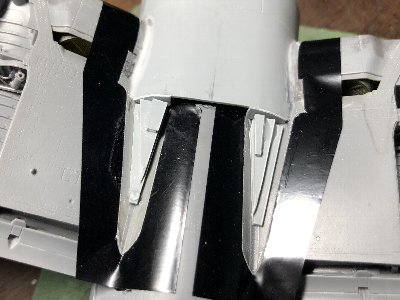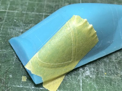 ![]() レドームおよびキャノピ後方フェアリングのフチをスジボリ。まず、マステで形を写し取る。 |