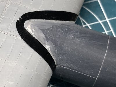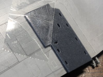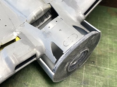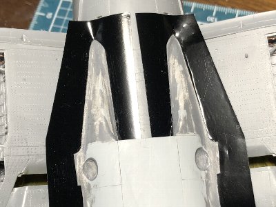 ![]() 主翼との接合部の隙間を処理。プラバンを貼って主翼と擦り合わせる。 |