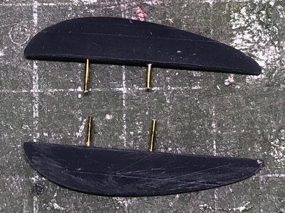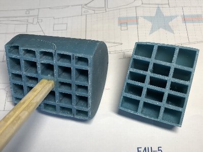 風防&キャノピをヒートプレスでスクラッチする。従前の記事の繰り返しになるが、ヒートプレスのやり方を解説する。 今回は1/32でモノが大きいので、0.4mmの透明プラバンを使い、出来上がりは1.0mm厚を目指す。木型は0.8mmオフセットで、1.0mmから凸凹の整形で0.2mm削ってジャストサイズという目論見。B4のプラバンを4つに切る。軍手二枚重ねで保持し、ガスコンロの弱火で加熱、中央が柔らかくなったところで型に被せる。 その際、押し下げが強いと側面が薄くなる。弱いと裾が型に密着しない。塩梅が難しい。風防キャノピそれぞれ10個くらい絞っていいのを採用。3DPの型でも、この程度の繰り返しであれば、熱には耐える。木型から外す際は、裾を回転ノコでカットする。出来上がったパーツは、内外両面の凸凹を均して磨くので、木型は磨く必要がない。 |