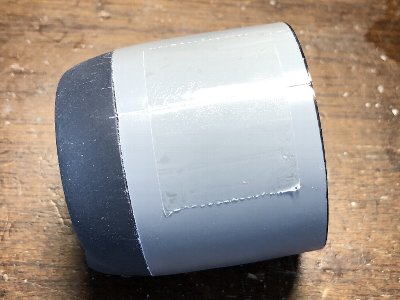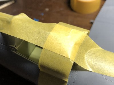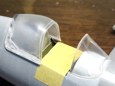 ![]() 胴体に合わせて擦り合わせ、内外面を#800ペーパーで均したところ。マステは、コクピットに指を突っ込む事故を防止するため。 |