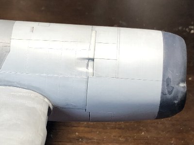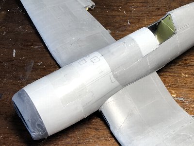 カウル上面は、パテを盛るかプラバンを貼るのが手っ取り早い手段だ。しかしそれだと表面処理が厄介なので、クサビを入れて広げるわけ。横への広がりを抑え込むと、上に盛り上がる。これならクサビ部分以外は真っ新のプラ地のまま。上面を持ち上げた分だけ下面を凹ませる必要があるが、修正量はプラバンの厚み以下なので、そこは削りで対応する。 とりあえず、胴体のリベ&ベコは終了。あとまだ尾翼関係が残ってるけど、もう少し先で考えよう。つうことで、次は胴体のスジボリ。以下画像で。 |