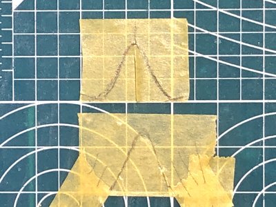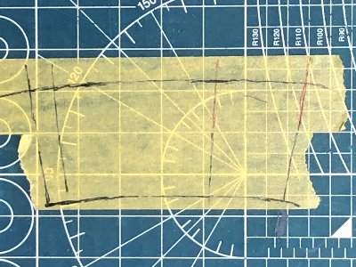 ![]() スジボリのテンプレートを作る。マステをジャストサイズの3Dパーツに貼って、スジボリをトレース。 |