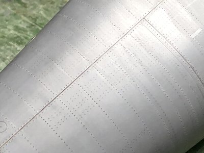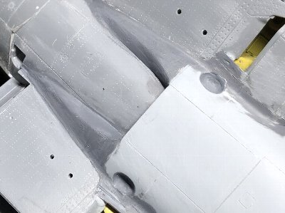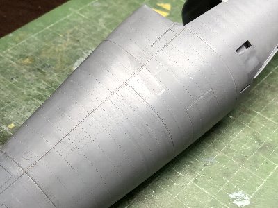 胴体のリベットと凹み表現は概ね終了。凹みは半丸ヤスリ(細)で軽くヤスった後、#600ペーパーで滑らかに仕上げる。フレーム位置の変更箇所は、先に針で点を打っておく。ペーパーがけでリベットが埋まり、ケガキ針でつついて彫り直し、再びペーパー。なんとも面倒くさい。ヤスリの傷が意外と残ってその処理も手間。凹み再現やるんじゃなかった、と後悔することしきりだが今更戻れない。 |