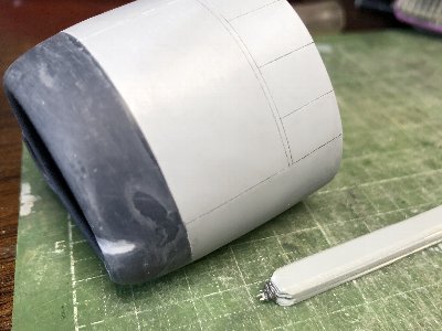 ![]() カウリングもスジボリ。二重線は0.8mm間隔のダブル針で。ファスナのたまぐりは後で。インテイク脇の凹みにタミヤパテ。 |