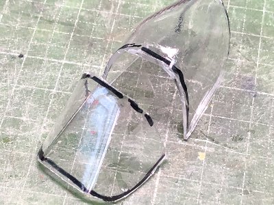 ![]() ジャストサイズの風防&キャノピ。胴体は別ボディ。イメージ確認のためスジボリ(※)を入れる。 |