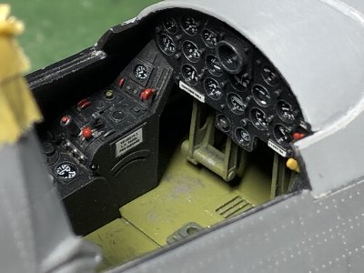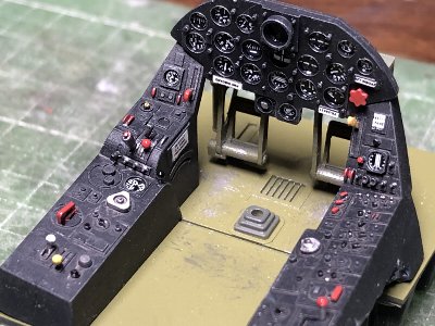 ![]() 計器盤出来上がり。注意書きは、適当なデカールを切ったもの。赤いツマミはフットペダルの位置を調節するものらしい。 |