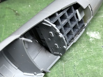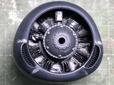 ![]() カウルに組み込むと、奥の方は見えない。少しドライブラシした方が、モールドが目立っていいかな。 |
