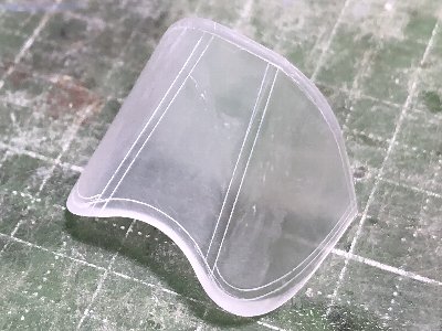 何度かやるとコツも分かってくるが、一応解説。プラバンを下に強く引き過ぎると薄くなる。引きが弱いと木型と隙間ができる。丁度良い塩梅が難しいが、何度もトライするしかない。バキューム方式は、強く引いたのと同じ状態になってとくに側面が薄くなるから手絞りの方がよい。プラバンの無駄も多いし。 プラバンを切り出すサイズも重要。大き過ぎても小さすぎても上手くいかない。1.0mmを絞って出来上がり0.8mm、という想定で木型をインセットしたんだけど、加熱で縮んでその分厚くなり、それを引き伸ばして結局出来上がり1mm程度。ま、このくらいの誤差は許容範囲じゃ。 プラバンが冷えたら切り出す。金属用のハサミが便利。ニッパーでもいい。さらに、木型につけた切り出し位置のモールドを目安に形を整えていく。このモールドは極めて有用。モールドなしだと左右歪みなく切り出すのが難しいが、これがあることで歪んでるかどうか確認できる。接着は瞬間。裏からもしっかり補強する。 |