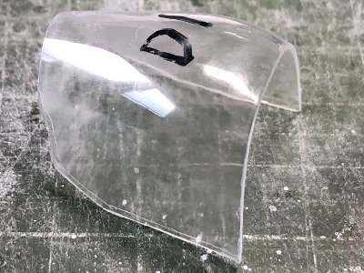 ![]() 再掲。プラバンを絞って、ざっと切り出したところ。木型のスジボリを目安に、切り出し位置を油性ペンで描く。 |