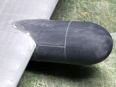![]() 3DPのキャノピ後方フェアリングを接着。隙間を埋めて整形中。接合ラインが凹線なので面倒くさい。 |