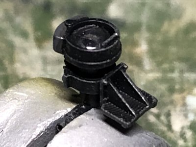 ![]() レンズは、ウェーブの透明レンズパーツ2.5mmを使用。メタルプライマーを接着剤がわりに。写真だと基部の積層痕が目立つなあ。 |