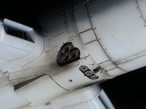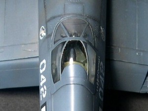 コックピットは、スロットル操作部をハセガワ1/48サンダーボルトから流用したが、基本的にモールドを丁寧に塗り分けるだけで十分。コックピット内部はグリーン系のジンクロで、計器板、サイドコンソール、グレアシールド、ヘッドレストが黒(いつものとおりダークグレーで塗装)。グレーや銀でドライブラシ。