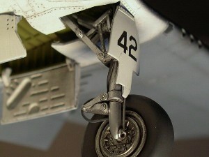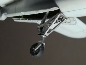 製作中の破損防止に主脚を先に接着しておく。右内側フラップの穴は、−1aにはないのでプラ板で埋める。接着に際しては、仮り組みと摺り合わせを十分に行う。そのままでは、フラップ相互の隙間が開きすぎるが、外側から順に翼に接着し、胴体との間に隙間を集めると目立たない。最内側フラップが少し外側に位置するよう、取り付け部を摺り合わせる。