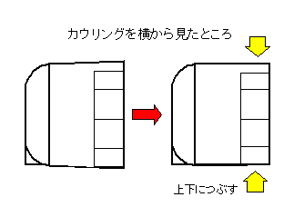 タミヤ−1の胴体は最前方のパネルラインの箇所で全長を2.5mmカットする。ハセガワ−4からはカウリング部分をカットする。このキットは胴が太い。正しくはカウル後端での高さと幅は、カウル前面パーツと同じ。そこで、左右の接合部を後端で2mmカット。上下につぶすようにパーツを曲げる。接着後は左右にランナーでつっかい棒をしておくと、上下に広がらない。