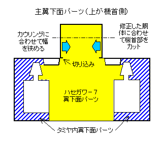 主翼は、下面の主脚庫より内側部分が−7で、あとは全てタミヤ。内翼上面にタミヤのエアインテイク部分を先に取り付け、現物合わせで不要部をカットした−7の下面パーツを付ける。インテイクのベーンは3枚が正しいのでノミで削る。主翼下面パーツと一体の機首胴体下部は、タミヤの胴体に合わせて先端をカットする。翼との境に切り込みを入れ、正しい幅に曲げる。