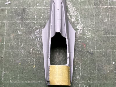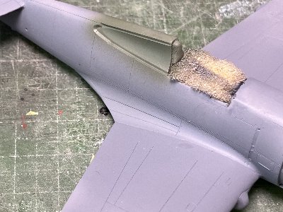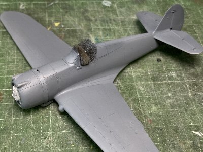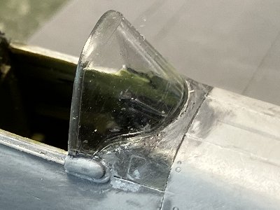 ![]() 風防パーツを胴体に接着。透明だと見づらいのでサフを塗っておく。風防後端と胴体とは段差がある。 |