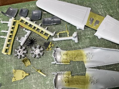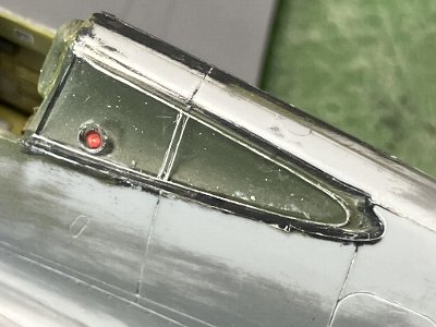 可動キャノピはオープン固定にする予定。後方窓の前半はキャノピに隠れて目立たないので、合わせ処理もテキトーでよいかな。燃料キャップは、旧作H-81の流れで赤にしたけど、あとでインストをよく見たら銀か黒の指定。ま、いいか。アクセントになるし。窓の穴は自分で開ける。断面を薄めたグレイで塗ると目立たない。