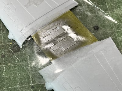 可動キャノピは、開状態だと内側を削れば上手く収まるが、閉だと少々過大。熱湯に漬けて幅を狭めるといいだろう。やり方は1/48ハリケーン製作記など参照されたし。また、その場合は胴体側も合わせを調整する。 全てのスジボリは、ラインチゼルやケガキ針などで彫り返し、表面を一皮剥くように削る。この一手間でスジボリがシャープになる。後日、翼機銃口の小パネルのスジボリ忘れに気付く。うぬぬぬ。でももう修正しない。