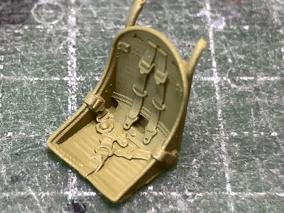 ![]() アルマ社純正の3DPシート。今回はこちらを使う。バルクヘッドと一体だが、そこはプラパーツを使うので、シートのみ切り出す。 |