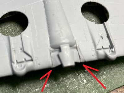 2つ目は、胴体下面のラインだ。キットなりに組むと、下腹(主翼下面のフェアリング)が1mmほど垂れ下がる。下面なので完成すればよく分からないから、気にしないことにしよう。