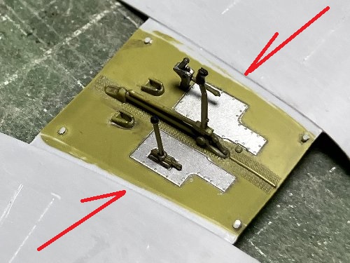 ![]() 主翼パーツの内側に真鍮線をがっちり接着。脚庫の壁の高さを0.3mm削る。 |