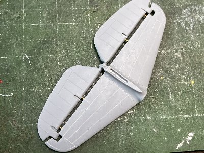 ![]() 水平安定板とエレベータを、真鍮線を介して接着する。エレベータ、ラダーのリブのモールドは残す。 |