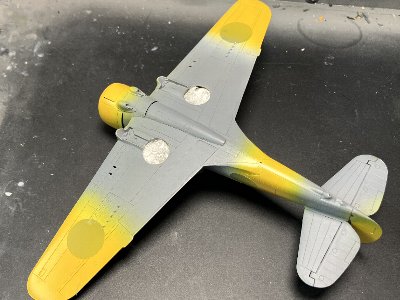 ![]() 続いてRLM04を塗装。黄色は厚塗りしないと赤が発色しない。まずオレンジイエローを薄く吹いて赤味を乗せてから04で戻す感覚。 |