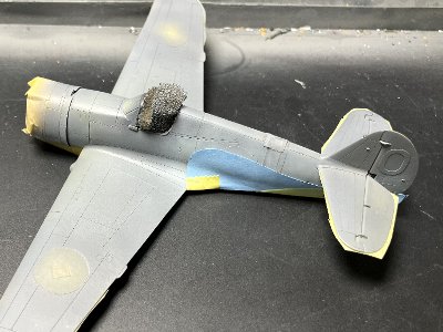 ![]() トゥルーブルーを塗装。レシピはGX5スージーブルーとC37 RLM75が半々に白少量。ここで全体にセミグロスクリアを吹く。 |