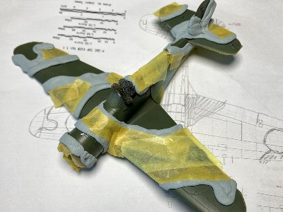 前回記事で、下腹が垂れてるが気にしないと書いた。が、やはり気になるのでライザップでダイエットだ。完璧にやろうとすると大ごとになるので(理由は後述)、出来る範囲内でやる。こりゃチョコザップじゃな。 さて、下腹。説明しよう(byヤッターマン)。キットなりに組むと、防火壁付近で胴体高さが1mm過大。上面ラインは正確で、腹だけが垂れ下がる。そもそもの設計でのラインが違うのか、合わせの問題なのか、原因はよく分からないが、私の印象は、主翼取り付け位置が0.3mm低く、付け根の翼厚が0.3mm厚く、フェアリングが0.3mm出っ張り過ぎで、それぞれ単体では問題ないレベルなのが、トータルでは1mmになってしまったのではないかな。 チョコザップ計画は、主翼と胴体の合わせ、主翼上下の合わせ、フェアリングの3本柱で、それぞれで少しずつ高さを減らす。そして、下翼パーツを上に押し上げるように(翼厚さをつぶすように)接着する。単純に押し上げると胴体に押されて上反角が減るので、内側に真鍮線を入れて正しい上反角をキープする。 |