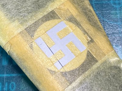 ![]() 今回、白と黄は先塗り方式とする。まず半艶白(GX1+C62)を吹き、国籍マークをマスク。グレイはオラマスク810。 |