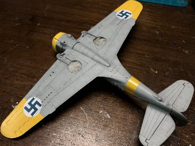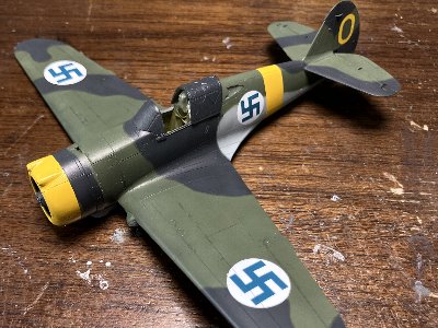 脚部の塗色については、以前作ったフライングタイガースのH-81と同じにする。すなわち、脚柱、斜めロッド、ホイルは銀(C8+クリア)、ホイルキャップ、脚カバー内外、脚柱収容部内面は迷彩色である。同じような時期に同じ工場で造られたから、それでいいのではないかな。 しかし、アメリカで造られ、フランスで使い、ドイツが奪い、フィンランドに売った機体の脚回りの「迷彩色」が何かは、はっきりいって謎だ。でもまあそこは深く考えず、フィンランドの工廠でフィンランド制定色にきっちり塗り直した、と解釈しておく。 |
