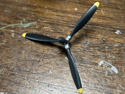 ![]() プロペラ出来上がり。スピナは迷彩色のダークグレイ、ブレードは白20%混の半艶黒。先端の黄色については本文参照。 |