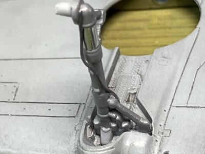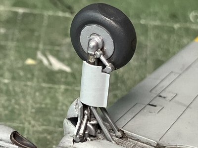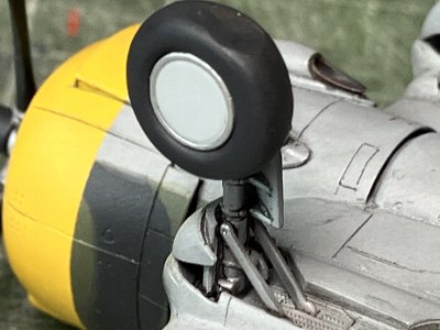 ![]() 丁寧に整形し、0.2mm鉛線でブレーキライン。オレオにメタルフィニッシュ。インストと手順を変え、先に翼に脚柱を接着する。 |