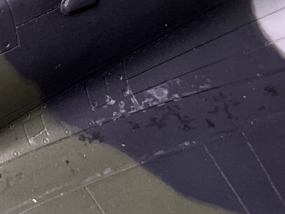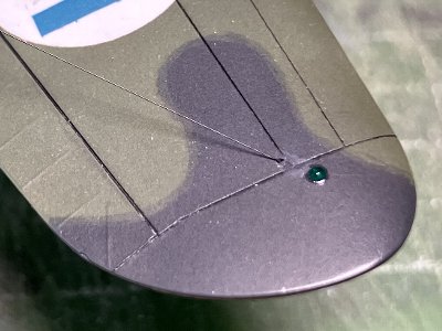 当機の写真は右舷のみ。左舷の迷彩パターンは、既存塗装図や他機からの類推。しかしこれらは、水平尾翼の下の胴体は下面色。一方、右舷は緑が下に回り込んでいる。同一機体で左右の下面塗り分けラインが大きく違うのはどうかと思い、左舷にも緑が回り込むと推測する。他機は機体ごとのバラツキではないかと。真相は定かではない。さらにいえば、上面パターンも既存塗装図から。手持ち写真でパターンが分かるものは持っていない。 迷彩塗装のマスクを剥がしたら、はみ出し、塗り残しを筆でタッチアップ。右舷の下面色塗り分けラインがイマイチ似てなくて、これも筆でタッチアップ。境界のぼかしは面相筆。2色を混ぜて境に細い線を描く。アップで見ると線が分かってしまうな。精進が必要だ。