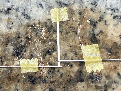 ![]() こんな具合に組んで、フラックスを垂らし、接合部にはんだの小片を置き、ポケトーチで炙る。台はホームセンターで買った石板。 |