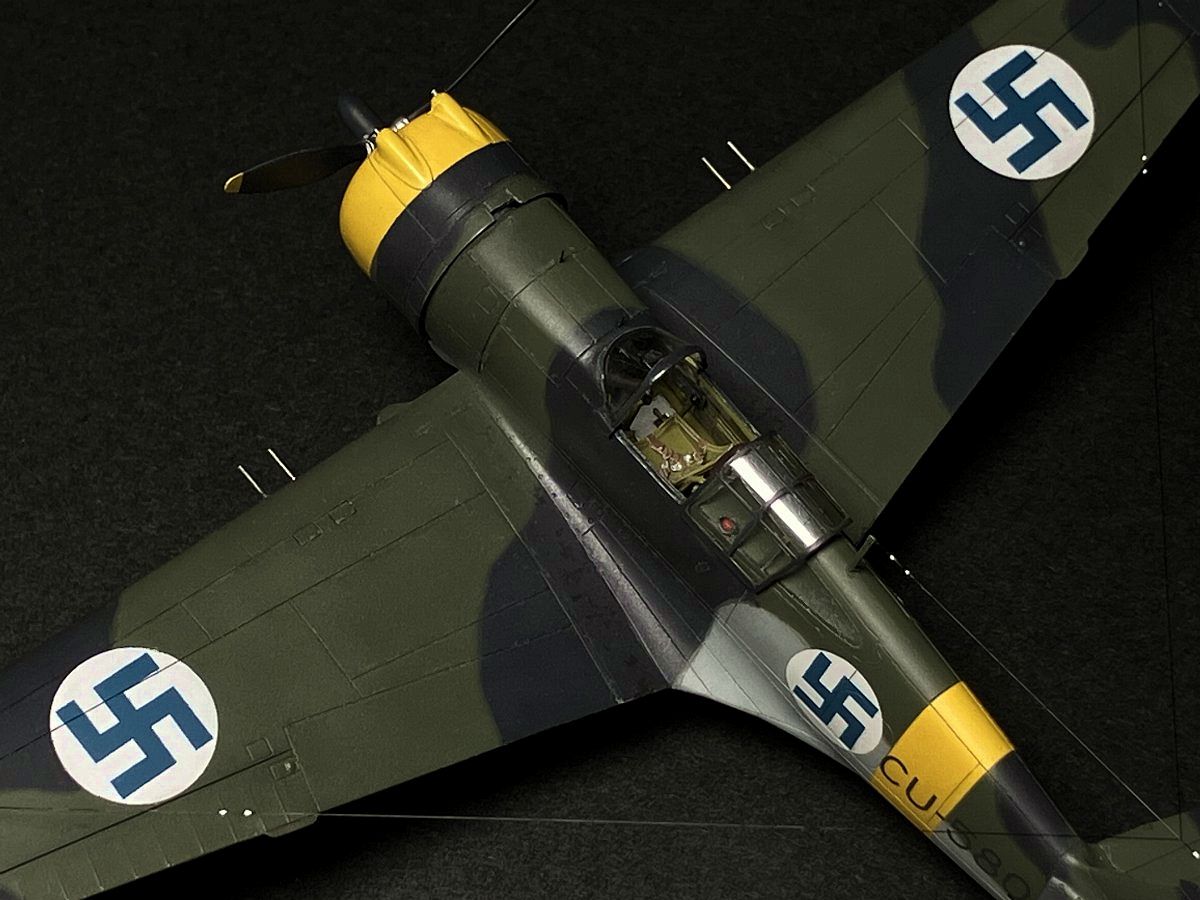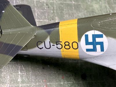 内部の塗色が悩ましい。インストではインテリアグリーンとなっている(Mrカラーだと枯草色だけど何故?)。ネットで調べると(※注)、輸出型のH-75の内部はグリーン系のようで、現存機のカラー写真でも、まあインテリアグリーンの範疇かな(経年変化は当然あるので)。 ということで、真相は不明だが、米軍向けP-40と同じカーチス社のインテリアグリーンとする。この色は他社のものより黄色味が強い。C351インテリアグリーンとC352ジンクロイエローを半々に混ぜる。細部はインストのとおりに塗り分け、デカールを貼る。EDSGでドライブラシしてウェザマス黒・茶でウォッシュ。 ※ https://www.britmodeller.com/forums/index.php?/topic/235118822-question-interior-color-finnish-h-75-hawks/ |