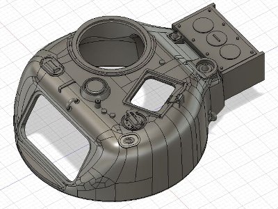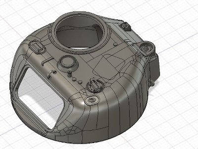 Fusionに取り込んでみると、基本形状の間違いに気づく。その時はBlenderに戻って修正する。再度出力し、それをFusionに取り込む。修正は、上画像4枚目の状態で頂点の位置を移動させる。サブディビジョンをかけた6枚目の状態では、点が多すぎて大変。そして、都度ミラーとサブディビジョンをかけてエクスポート。 Fusionに取り込む際は、「Fusion360でのディテール追加」に書いた方法を使えば、Fusionで同じ作業を繰り返す必要なく、設計がそのまま使える。このサイクルを繰り返して、形状とディテールの精度を上げていく。基本形状は、まずまずのところまできたかな。このあと、ハッチのディテールなどを加えていく。