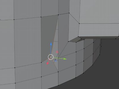 ![]() ハッチ周辺の面も作りこむ。ナイフで辺を増やしていくのが有効。減らすには辺(面)の溶解で。これで一応の出来上がり。 |