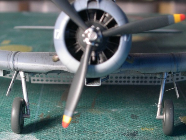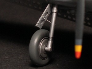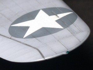 主翼下面のインシグニアにも黄縁があるとする説もあるが、最近西山洋書で立ち読みした本に、主翼下面が写った別部隊のトーチ作戦参加SBDの写真があり、不鮮明ながら黄フチはないように見える。直すとなると、ベタデカールをサークルカッターで切り抜けば直せなくもないが、前縁ぎりぎりなので難しいところ。決定的証拠写真が発見されるまでは放っておこう。