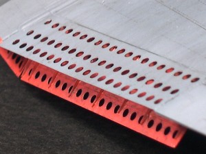 翼上面パーツからダイブブレーキ部分を切り取る。エッチングと大きさが微妙に異なるから、プラ板などでエッチングの大きさに合うよう修正。プラ板などで取り付けガイドを作り接着。完成後も触るとすぐに曲がってしまうので、上面のみはキットパーツを用い、薄く削りピンバイスで穴あけしたほうがよかったかも。