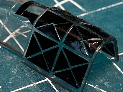 ![]() その前に、キャノピのマスキングをはがす。内側を掃除し(幸い、ほとんど汚れてない)、木工ボンドで接着。 |
