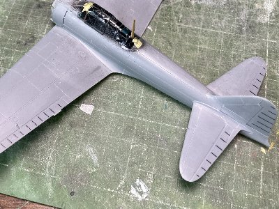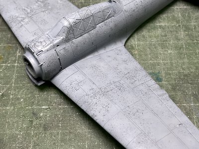 ![]() プラ下地最終チェックのサフを吹く。スジボリ脱線、風防の合わせ、接着面の隙間などの不具合を修正。この工程は大事。 |
