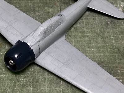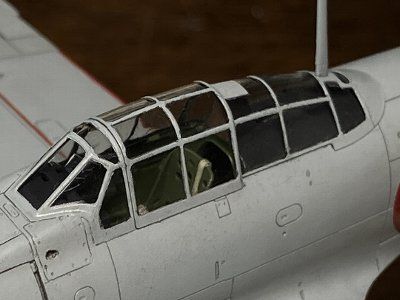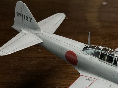 その他の工作は21型と同じ。写真も撮ってない。ピトー管は0.6mm真鍮パイプに0.3mm洋白線。アンテナ線は0.2号黒色テグス。脚表示棒を取り付け、給油口を赤で塗る。工作中、エルロンヒンジカバーが1つ行方不明。腐海(模型部屋のグレイの絨毯)に飲み込まれたか。52型のキットから持ってくる。 塗装面は、ラプロス#6000で磨いた8分艶を最終形とする。これも21型と同じ。訓練部隊で、搭乗員が一日の終わりに磨かされたと妄想し、艶ありめで。