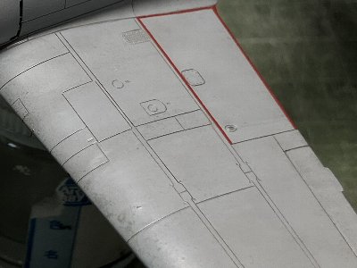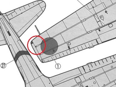 それと、翼主桁の端部は、キットや世間一般の図面では21型同様にフランジが広くなっている(下画像赤丸)。しかし、ここは52型と同様にストレートが正解。大刀洗の現存32型がその証拠(情報感謝)。折り畳みを廃止したら、フランジを広くする必要がなく、無駄に重量がかさむだけ。拙作はキットのまま。 大分空は、陸上基地だけど、訓練部隊だから着艦フックは「あり」と想像。陸上に張ったワイヤで着艦訓練したのではと思うが。実際はどうだろう? |