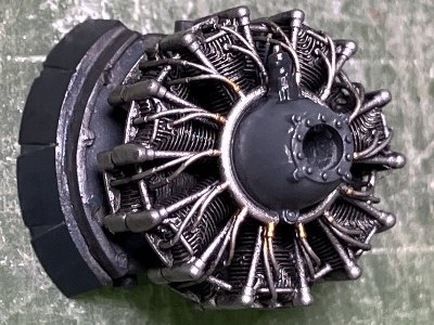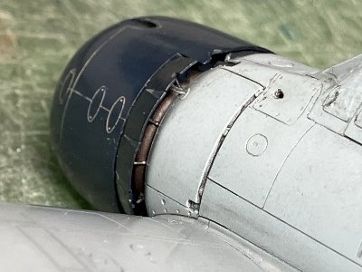 3DPご使用の皆様へ。エンジンとカウルフラップの接着面は、サポート痕で荒れている。そのため、入念に擦り合わせ、仮接着してカウルを被せ、スピナとカウルの位置関係をチェックして調整を推奨。←サボった私は、接着をはがしてやり直すはめに。