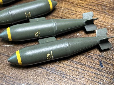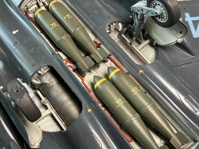 ![]() ウェポンベイに装着する。折角のディテールが隠れる。爆弾は接着しないで、取り外して遊べるようにしよう。 |